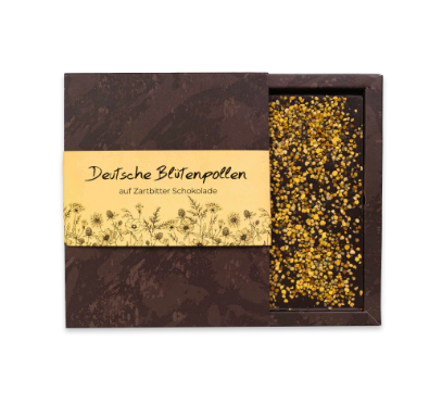 Zartschmelzende Vollmilch Schokolade mit feinstem Honig oder kräftige Zartbitterschokolade verfeinert mit deutschem Blütenpollen.