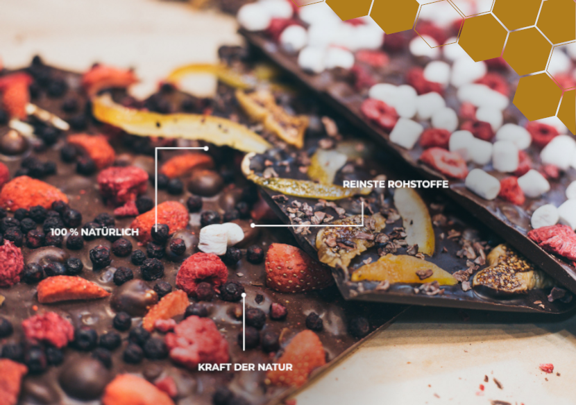 Das sind unsere handgemachten Schokoladen, hergestellt in Deutschland.