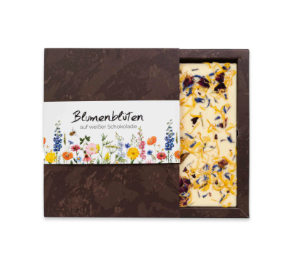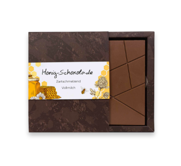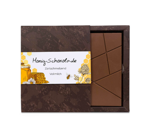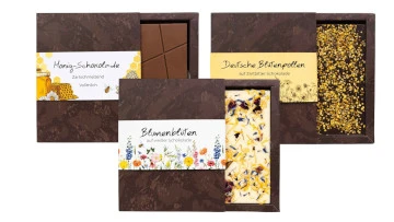 Zartschmelzende Vollmilch Schokolade mit feinstem Honig oder kräftige Zartbitterschokolade verfeinert mit deutschem Blütenpollen.